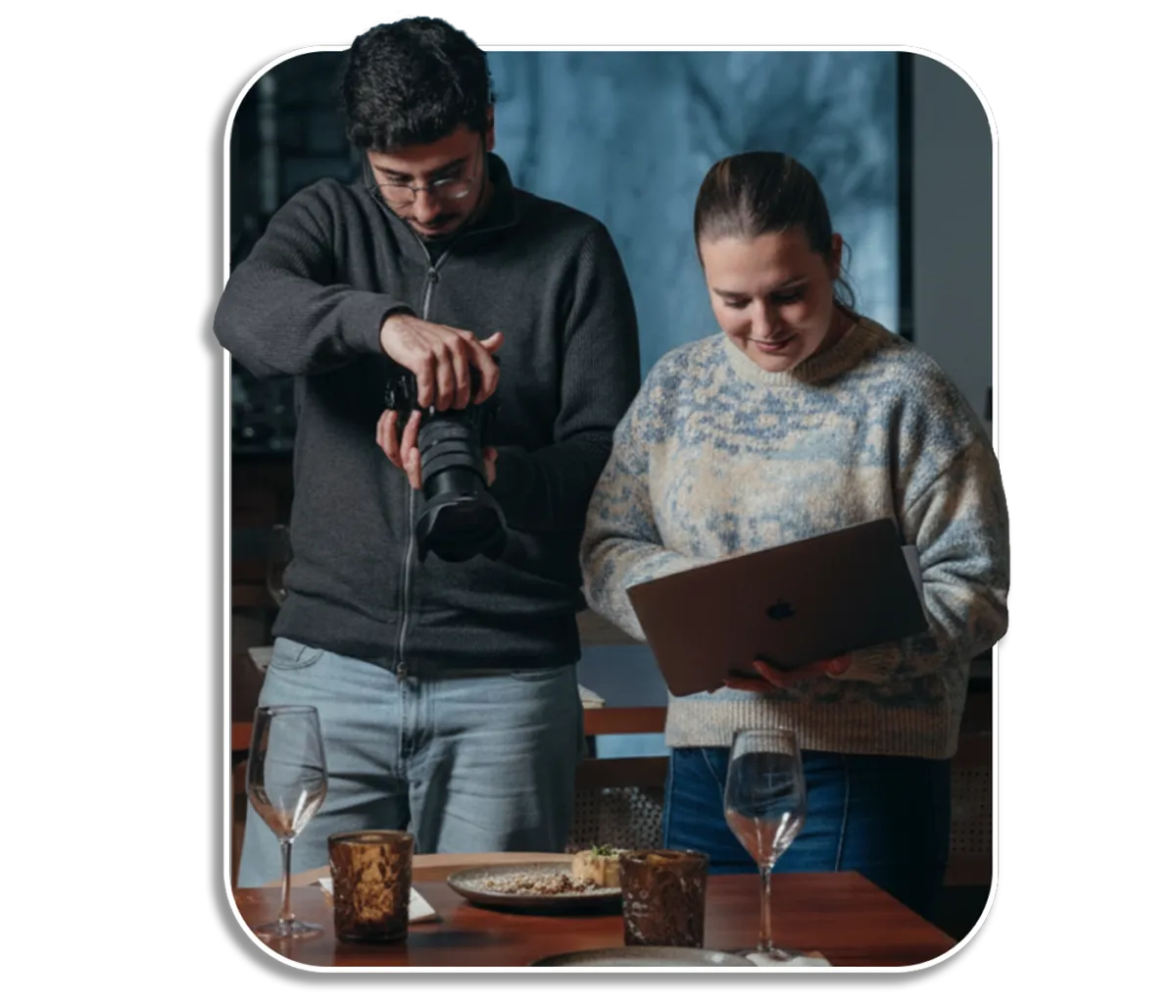 Somos a Sofia e o Pedro. Somos nós que vamos ao teu restaurante, que pensamos a estratégia contigo, e que garantimos que cada publicação representa o melhor do seu negócio.